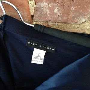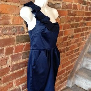 Navel blue satin cocktail dress. One sleeve and pocket on sides. good condition