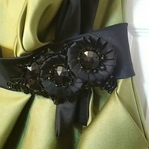 A Lazaro dress bright olive color with shimmer sweetheart neckline lenght is right above the knee really comfortable