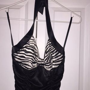 Cocktail dress, black and white top area, small, fits tight, straps around the neck only.