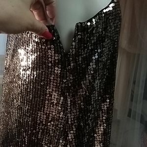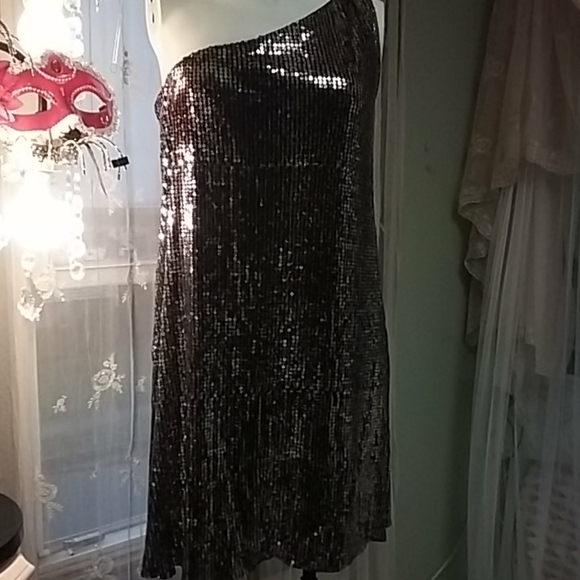 One shoulder Gold sequin mini cocktail dress. Zips down the side