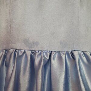 Does have some staining that I think with a good dry cleaning would come out. I believe it's water marks as we do not eat in our gowns for pageants. This was worn for an interview. This is another age appropriate dress for a young girl that's a bit bigger. Price reflects issues with dress.