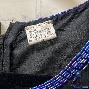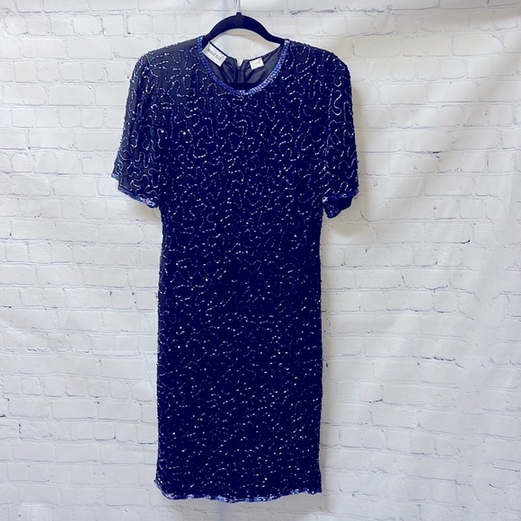 Vintage cocktail elegant dress in excellent condition. There is 2-3 sequins missing to the back of left arm but hardly noticeable. See picture.measurements: length 39” armpit to armpit 16” waistline 28.