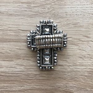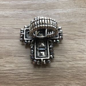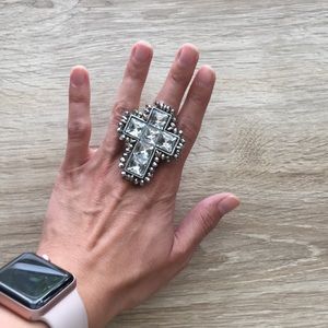 Super fun, boutique, cross cocktail ring! Bright, blingy, and oh-so-sparkly! Stretchy band so it fits almost any finger size.