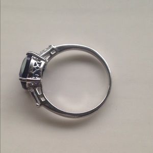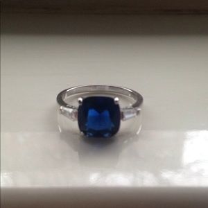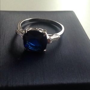 Silver colored cocktail ring, with deep blue glass stone in a square basket setting. Size 10
