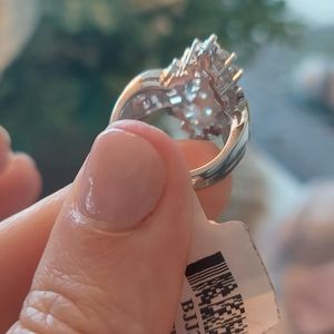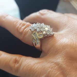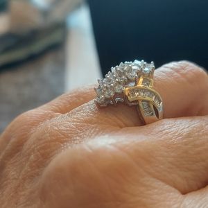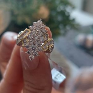 beautiful cocktail ring. faux diamond ring! I'm not sure of the material but haven't tarnished. very flattering! new with tag. size 5