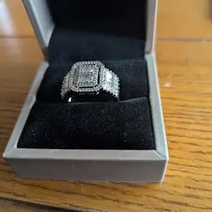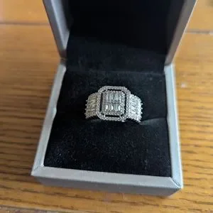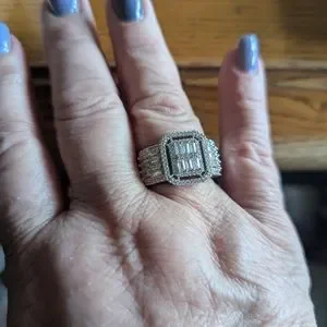 Large CZ cocktail ring with large square set stones in the center and 5 rows of baguettes on each side. Has a great presence on the hand if you like your bling to show! Set in silver