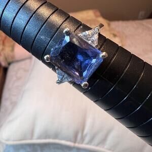 Dramatic purplish blue rectangle shaped stone & trillion shaped crystals Sz 9 1/2. EUC
