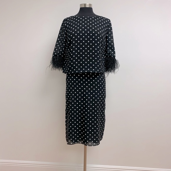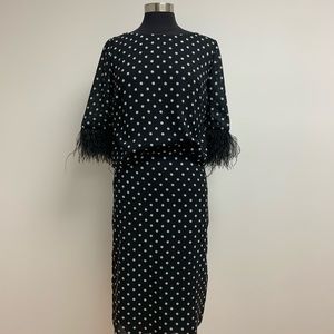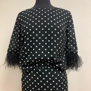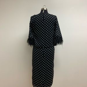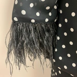 Two-piece suit with polka dots and feathered sleeves.