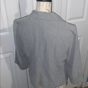 Gray, Dry clean only. Beautiful blazer. Good for work or a night out. I love the cut and shape of this blazer. Worn once still has a lot of wear.