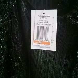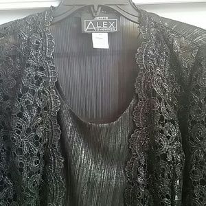 Black 3/4 length sleeves. Shimmering shell with black shimmering lace overlay. Petite