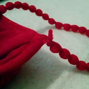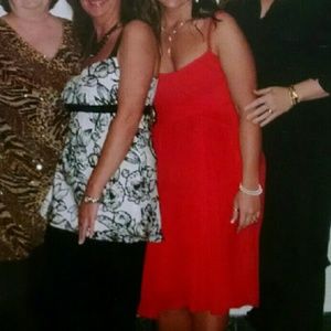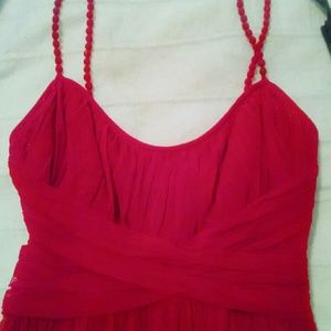 Stunning red hi-lo dress with bead spaghetti straps. Worn once for event. One strap is slightly loose, just needs tightened with matching thread.