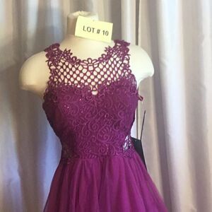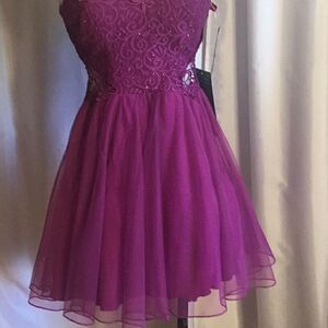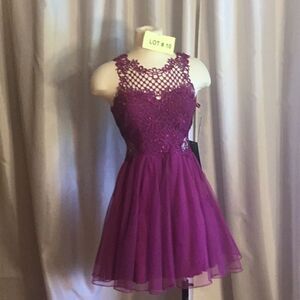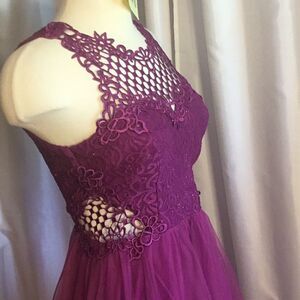 Cocktail/party dress with lace cutouts at neck & sides in plum purple size 5