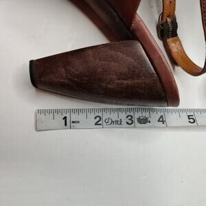 Coclico Anthropologie 'Fito' Brown Leather Fringe Peep Toe Sandals Size 36. In excellent used condition with just a few signs of wear; shows general wear on the soles. The heels have genuine leather uppers. They feature an adjustable ankle strap with brass tone hardware & a fringe front. The heels sport a chunky wooden cone heel that is wider on the top and tapers towards the bottom/base. They have a slightly squared off almond toe box. The Insole layer is presenting slight lifting (can be seen in the last image). The heels have an approximate heel height of 4.5”.