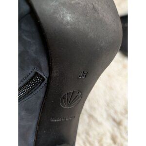 European size 38 stamped on sole. Some scuffs visible on leather surface. Heel height approximately 3 inches. Condition reflects light pre-owned wear.