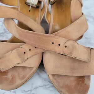 Pre Loved with some damage on the cork on one shoe and the leather footbed is peeling up a little at the toe area, wear to the bottom soles.