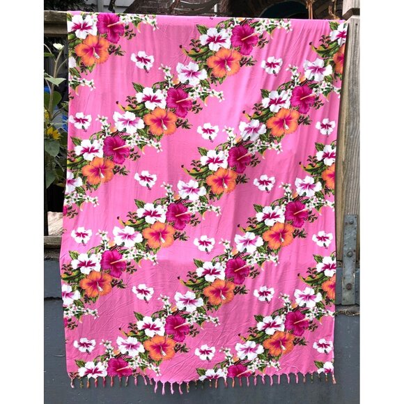 Channel your inner Barbie with this vibrant tropical Coco Beach Hawaii sarong. It is printed with a striking hibiscus pattern. The sarong is pink, with white, green, and orange detailing – perfect for adding a pop of color to your beachwear. Use this versatile sarong as a skirt, dress, beach coverup, oversize headwrap, scarf, or casual evening wrap.