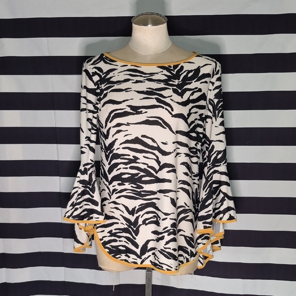 Chic zebra print blouse with vibrant yellow trim. Flared sleeves add elegance.