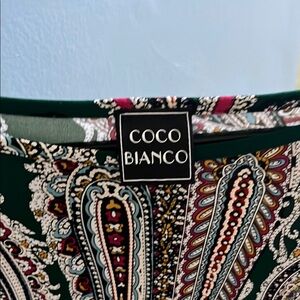 This Coco Bianco blouse features a vibrant green hue with elegant ruffled detailing and 3/4 sleeves. The sophisticated design makes it a versatile addition to any wardrobe, perfect for both casual and formal occasions.