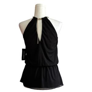 Coco Bianco Halter Top Black Gold Tone Chain Neckline Sleeveless Blouse Small