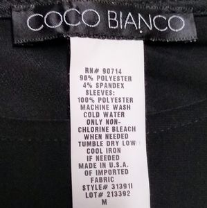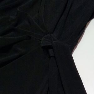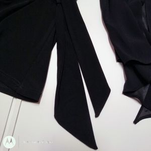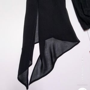 Looks new! Sexy is back in this gorgeous black satin like top. Features sheer trumpet sleeves with a slit in each one, round neck, and a side tie that cinches the waist.96% polyester with 4% spandex that gives a nice stretch. EUC!