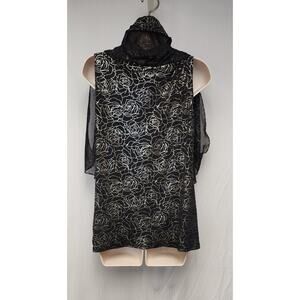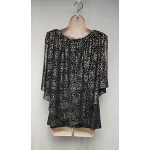 Coco Bianco Women’s Floral Print Top Flutter Sleeve Black/Silver Blouse Size Medium