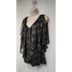 Coco Bianco Women’s Floral Print Top Flutter Sleeve Black/Silver Blouse Size Medium