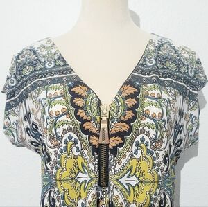 Stylish Coco Bianco women’s top in size Medium. Features a vibrant multicolor paisley print with yellow, green, black, and white tones. Gold-tone zipper detail at the neckline adds a modern touch. Short sleeves with solid black side panels create a flattering silhouette.
