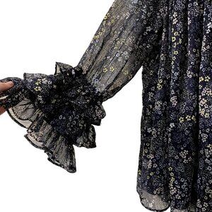 A floral blouse with long sleeves and frills. Sheer sleeves with a full lining. Labeled a women's size small.