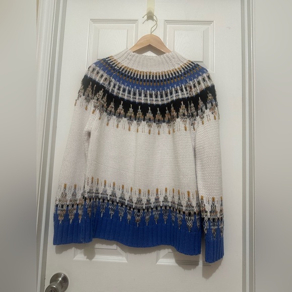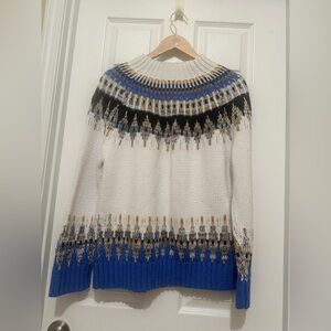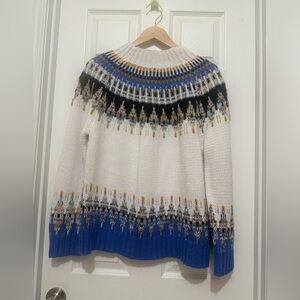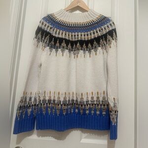Stylish knit sweater with a multicolor pattern. Features blue, black, and white hues. Pre owned and has signs of used.