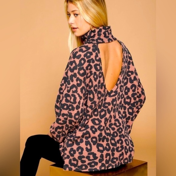 Coco Brown n Black Leopard Top. Top has mock neck w/full sleeves. Peek-a-boo back. Stops mid/upper hips. Runs big.