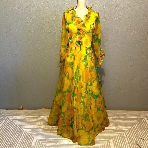 Coco California vintage yellow and green floral maxi dress. No size tag.