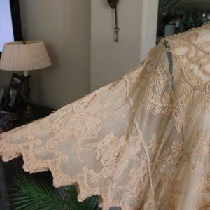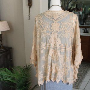 Beautifully detailed lace cardigan with bat wing three quarter sleeves. NWT no flaws. Beautiful over a tank with jeans or a tank dress. Dress shown is available on a separate listing. Mannequin has on a S/M.