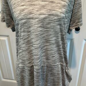 Excellent pre-owned condition, no flaws, dress by Coco + Carmen size XX-large. Faux wrap look across bottom front. Dress is short sleeve in a heathered gray and charcoal with white making almost a space dye effect. Seam at waist accentuates waistline and can worn straight down or flounced over for a shorter overall length. Fabric is very soft and has stretch, as well as ruching along one side, very comfortable.