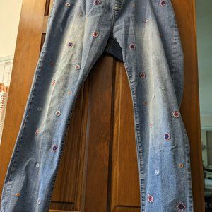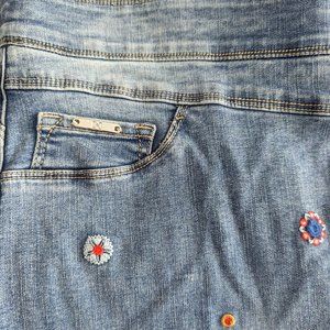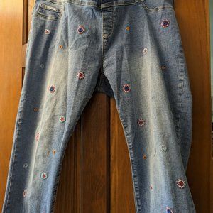 Super cute Coco + Carmen light colored ankle/cropped/capri jeans with embroidered detail on front. Size XL, stretchy, very roomy with elastic waistband. Like new - nonsmoking home. 26" inseam. 18-19" across waistband. Depends on how tall you are - I'm petite - so these were ankle jeans on me !! The perfect pull-on skinny jean for every body type! OMG jeans combine the comfort of a smoothing fabric with street-chic style. Tummy-slimming, wide elastic waistband holds you in (goodbye, muffin top) and lifts you up. Materials: Cotton/Polyester/Spandex. Size equivalent 16-18.