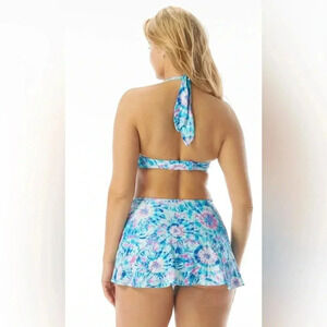 Coco Contours Halo Sarong Swim Skirt is a modern must-have. The Halo is a contemporary swim skirt featuring an attached mid rise bikini bottom that is designed with our Patented Shapemaker® Lining to smooth your curves and lift your bottom to accentuate your figure. This contemporary skirted bikini bottom features a sarong over skirt in a tie dye print with a fashionable front tie that offers plenty of coverage.