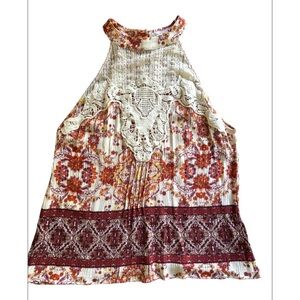 Floral blouse with Crochet details and vintage looking lace across neck.