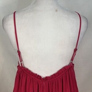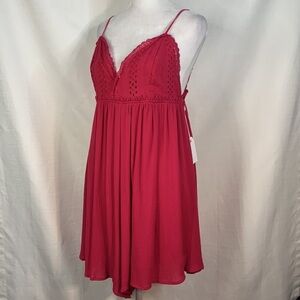 Looks like a fit and flare summer dress, but is actually a flowy romper. Bold, fuchsia coloring looks great in the spring and summer! Crochet style, V-neck cut with adjustable, spaghetti straps. Elastic waist band hits just below the bust and leads into creped material. Fully lined.