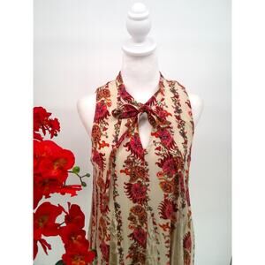 This sleeveless dress features a bow tie neckline and a waist tie closure, adding a chic touch to the floral patterned design.