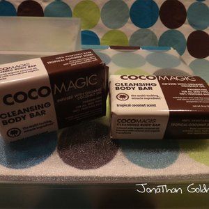 Coco Magic Cleansing Body Bar soaps, manufactured by Jocott Brands. These soap bars rejuvenate and moisturizes skin, with an island coconut scent. Ingredients: Sodium Palmate, Sodium Cocoate/Sodium Palm Kernelate, Water / Aqua, Glycerin, Fragrance (Parfum), Cocos Nucifera (Coconut) Oil, Sodium Chloride, Tetrasodium Etidronate, and Pentasodium Pentetate. Each soap bar is 5 ounces. These brown and beige packages are brand new in the retail factory packaging, never opened.