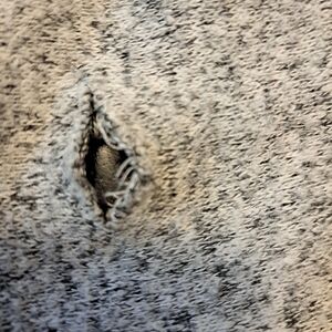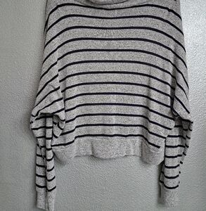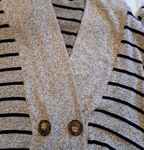 heathered grey & blue striped, shawl neckline, four button closure, one of the button holes needs to be sewn (see pic), drop shoulders, bat wings, pit to pit 31" sleeve 15" length 22"