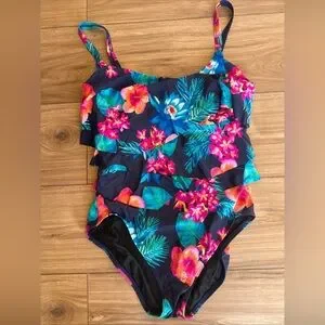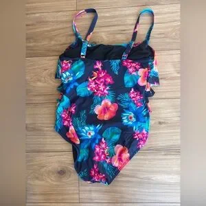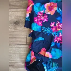 The Coco Reef Charisma Bra Sized Underwire Bandeau One Piece Swim in size 12 with 36DD cups is a stylish and flattering swimsuit designed for women. Featuring a floral pattern in a multicolor design, this bandeau top with spaghetti straps offers slimming and compression features with a built-in bra for added support. The bikini bottom adds a touch of playfulness to the overall look, making it perfect for beach days, tropical getaways, or simply lounging by the pool. Made from spandex material, this one-piece swimsuit is both comfortable and adjustable, catering to your personal style and preferences with its nature-inspired theme.