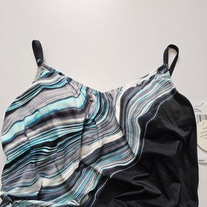 Go from poolside to vacation adventures in the Coco Contours Amaris One Piece Swimsuit. Designed with our patented Shapemaker® lining construction this one piece swimsuit smoothes your curves and lifts your bottom to accentuate your figure for confidence-boosting beachwear. Lively and vibrant, this unique silhouette features a multi-toned, whimsical print at its top, with contrasting black swim bottoms for a sleek, stylish look. Find your ideal fit with the wireless frame bra and adjustable straps that create confidence-boosting beachwear.