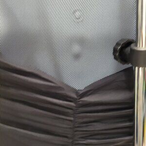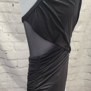 V-neck; front wrap detail; mesh inset at sides and upper back; ruched at center lower back