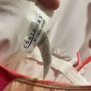Stylish one-piece swimsuit by Coco Reef. Features a vibrant pink and orange pattern. Elegant ruched front with halter neck tie.