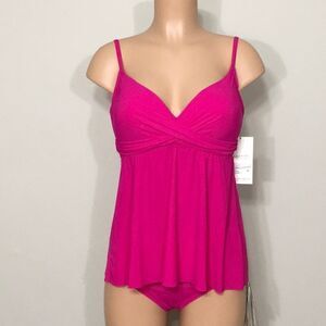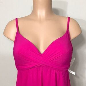 Soft formed underwire cups set into a shelf bra. Adjustable straps. Beautiful baby doll shape. Twist front V-neck bust. I love this color of pink! It’s a beautiful fabric. High-quality.