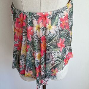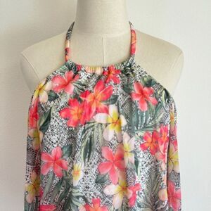 New with tags Coco Reef halter tankini swim top featuring a lightweight mesh overlay with vibrant tropical florals and a snakeskin-inspired print. Flowy silhouette offers flattering coverage with a supportive halter neckline. Tagged size 38D. Perfect for resort wear, beach days, or poolside glam.