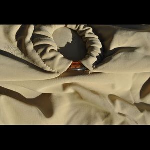 This shiny two-piece set with coconut shell hoop detailing is sure to amp up your whole holiday look. The one-strap top provides good chest support. The bikini bottoms have classic coverage and could be worn high or low rise. The swimsuit is fully lined with delicate fabric. Size M