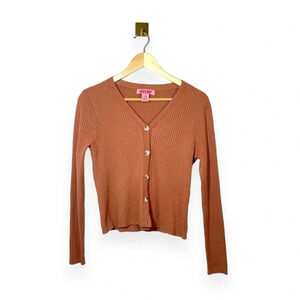 Coco & Shay Ribbed V-Neck Crop Cardigan Sweater in Brown Size XL