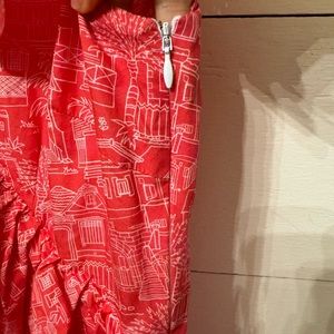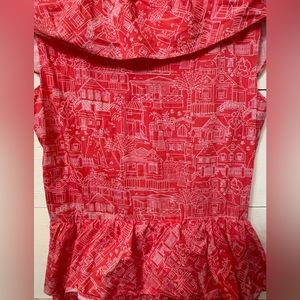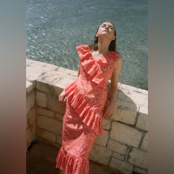 Features midi length, v-neck, allover print, sleeveless, ruffle detail. 100% cotton. Excellent condition, no flaws.