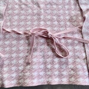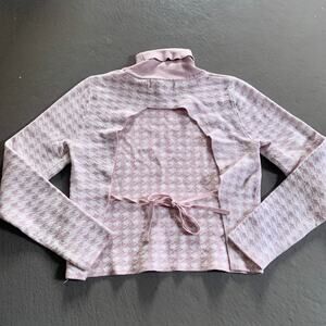 Dusty pink and white houndstooth knit with an open back and tie detail. Cropped fit with a turtleneck and slim silhouette. Tagged Large, best fits XS/S—see measurements.
